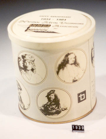 vorm:Rond met oversluitschroefdeksel;voren in bodem en deksel. vervaardiging:felslangsnaad en rolranden decoratie:grijsachtige ondergrond daarin 11 cremekleurige cirkels met tekeningen van Rembrandt in bruin op deksel logo van NMDA tekst:(deksel)Happy anniversary 1934-1984 National Metal Decorateurs Association inc. (romp)This can is coated on a roary screen Coater by Thomassen & Drijver-Verblifa NV the Netherlands.
