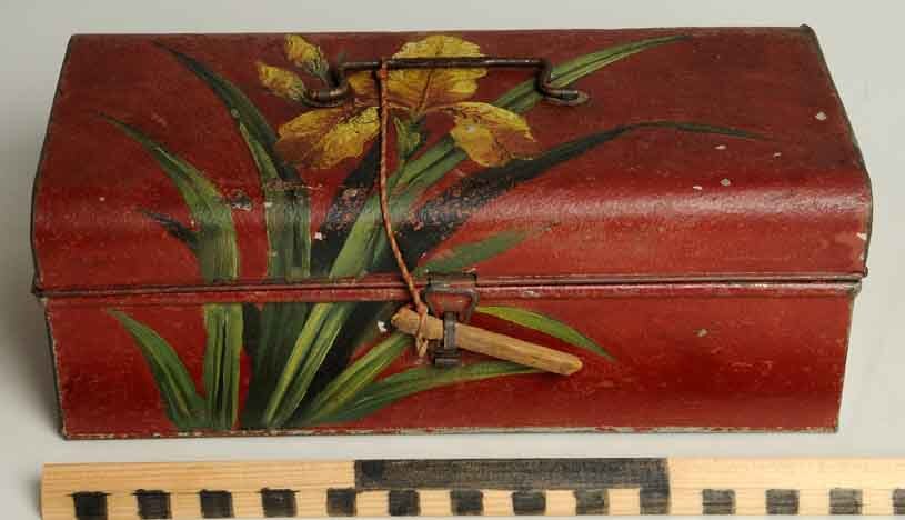 Rechthoekige trommel waarop afgebeeld een gele lis met een sluiting van een houten pen aan een touwtje