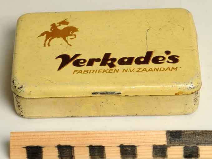 Rechthoekige doos met het beeldmerk van Verkade, een ruiter te paard met een winpel van Verkade's Fabrieken N.V. Zaandam