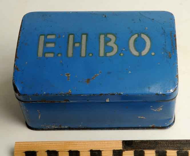 Rechthoekige verbanddoos met "E.H.B.O." op het deksel voor verbandmiddelen