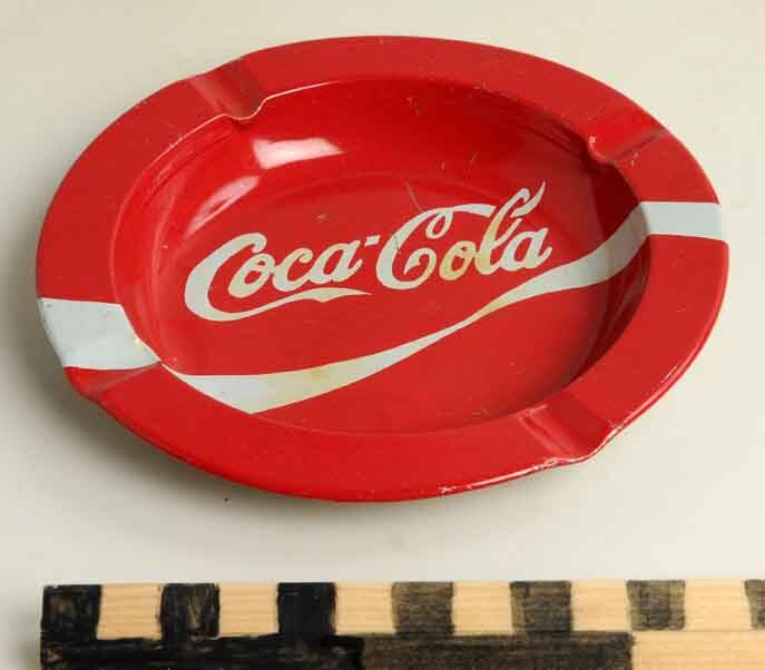 Ronde rood en witte asbak met daarop het logo van Coca Cola, met vier inkepingen voor sigaretten