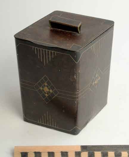Ruitvormige of vierkante trommel voor biskwie in art deco stijl met bovenop een handgreep, William Crawford and sons, Edinburough-London