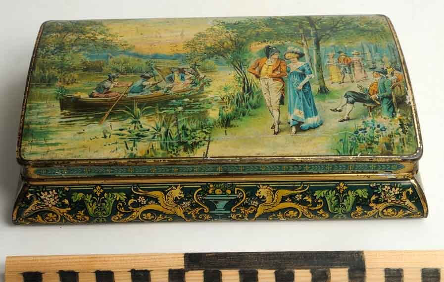 Rechthoekige doos met uitlopende basis en een afbeelding van een 18e eeuws gezelschap langs een rivier en in een park, op de zijkant fanatsiedieren als decoratie, Huntley & Palmers, Reading-London