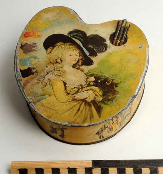 Een gele trommel in de vorm van een schilderspalet met in het midden een afbeelding van een dame met zwarte hoed en bloemen, op de zijde enkele tijdgebonden afbeeldingen, Huntley & Palmers Biscuits, Reading-London
