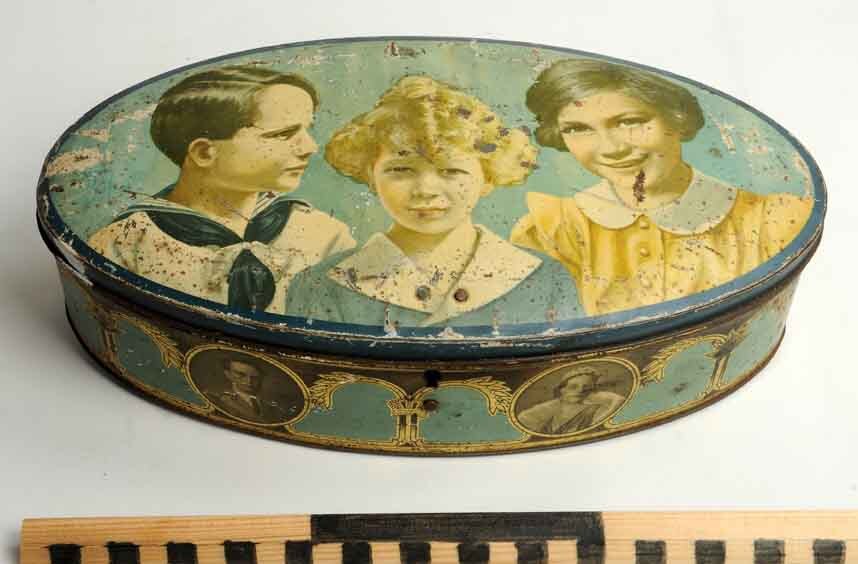 Ovale trommel met op de deksel drie fotoportretten van Boudewijn, Albert en zus, op de zijde afbeeldingen van Leopold, Astrid en foto's van de kinderen
