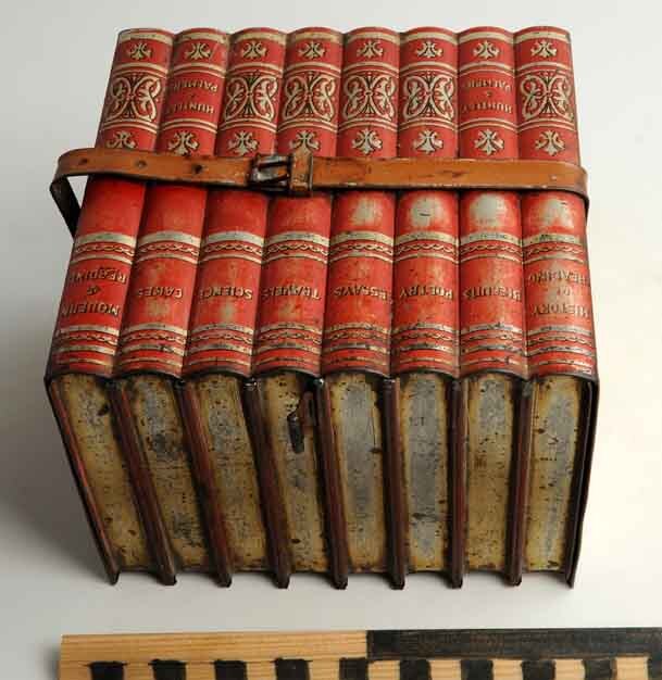 Een trommel in de vorm van acht rode boeken bijeengehouden door een riem van blik, met de titels: History of Reading, Biscuits, Poetry, Essays, Travels, Sciences, Cakes, Modern Reading, Huntley & Palmers, Reading-London