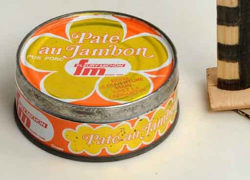 Rond busje in oranje en geel voor paté, met opschrift: Henri Michon paté au jambon pur porc, boite a ouverture main, tirez la languette