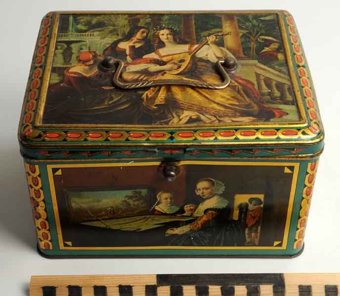 Rechthoekige voorraadtrommel met slot en handvat, op de deksel een luitspelende dame op de vier zijden afbeeldingen van muzikanten