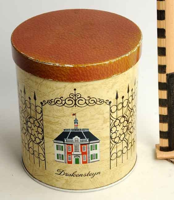 Ronde gele bus met bruine deksel en op de zijde een afbeelding van kasteel Drakensteyn met hek en wapen