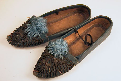 Paar kinderschoenen van blauw leer, metaaldraad garnering en pompoen van lichtblauwe zijde