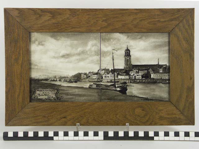 Tegeltableau bestaande uit twee tegels met in bruine pen en penseel een gezicht op Deventer. Linksonder een cartouche met de tekst 'Ter herinnering aan 9 april 1922'