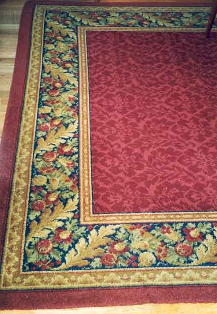 Deventer tapijt met veelkleurige rand met bloemen, bladeren en vruchten en daarbinnen rood middenveld met ton-sur-ton patroon