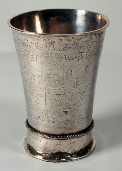 beker van het koekbakkersgilde; hoge beker met iets uitwelvende rand en afbeeldingen van het ambacht van koekbakken, wapen koekbakkersgilde en deventer adelaar; opschrift: Hendericus Berensen 1659. Boven en onder de voorstelling loopt een inscriptie: Die Deventer koecken zijn door Geheel Holant Zeer Ghepresen om dat zij door eenen mengher ghemenght moeten wesen + Maer De ...