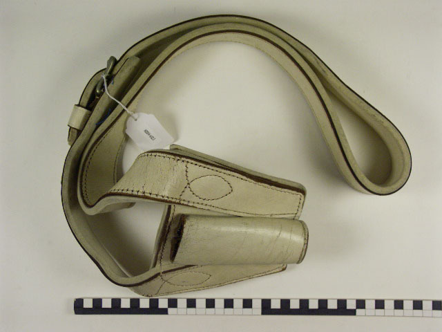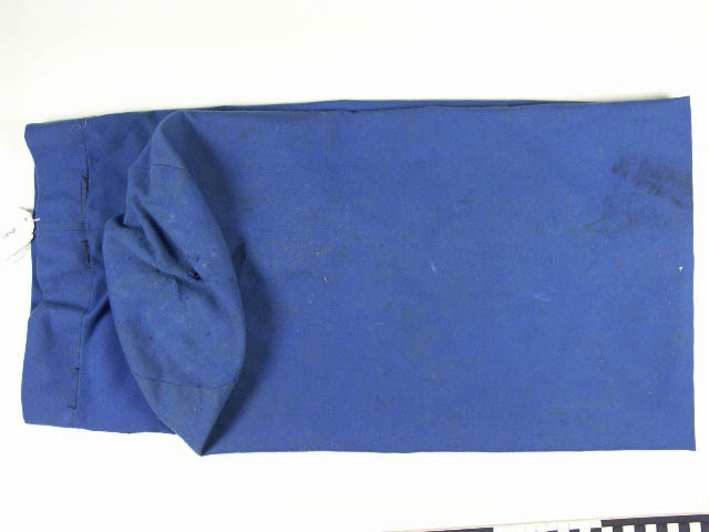 Vaandel, vaandeltop met medailles en vaandeldrager in blauwe zak van muziekvereniging 'Ons Ideaal', Deventer/ opgericht 12 augustus 1912