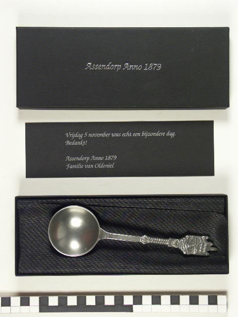 Tinnen lepel met de Waag, Assendorp anno 1879 in zwart doosje