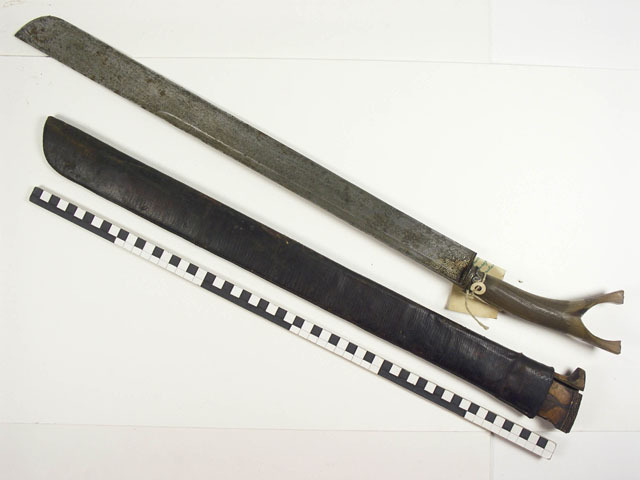Klewang Indisch model inclusief schede van hout die met leer is bedekt