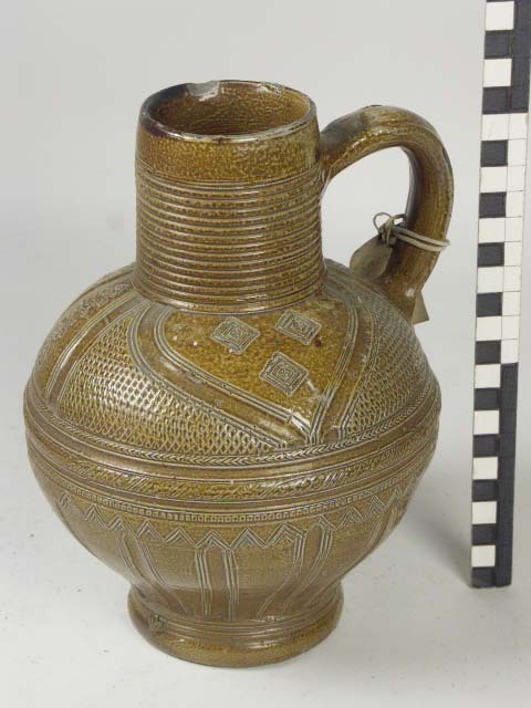 Steengoed kan met oor en ingekerfde patronen, Raeren