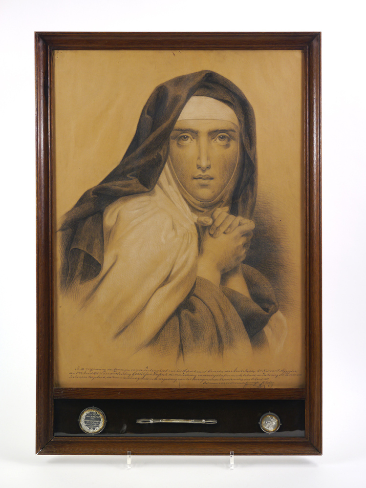 Portrettekening van een non met daaronder een zilveren tekenpen en twee penningen uitgereikt namens de Maatschappij tot Nut van het Algemeen, afdeling Deventer
