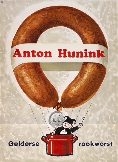 Affiche voor gelderse rookworst van Anton Hunink met afbeelding van rookworst als luchtballon en Hunink-mannetje in pan als mandje.