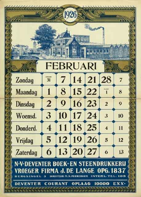 Kalenderblad, Februari 1926 met afbeelding van Boek- en Steendrukkerij D.B.S.