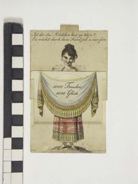 In elkaar te schuiven kaart met vrouw die doek met wens ophoudt