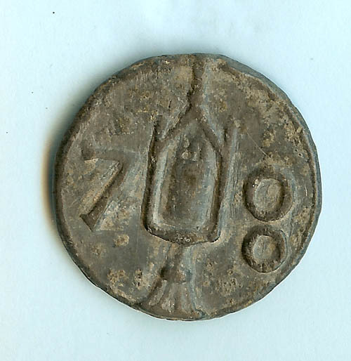 Gildepenning ? voorzijde een kelk tussen 15-78, keerzijde een reliekhouder tussen 7 – 8. Gilde en herkomst onbekend. Is het een mogelijke beeltenis van de roggestapel die van 1353 tot 1650 op de Brink stond?