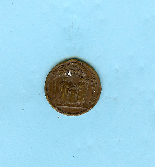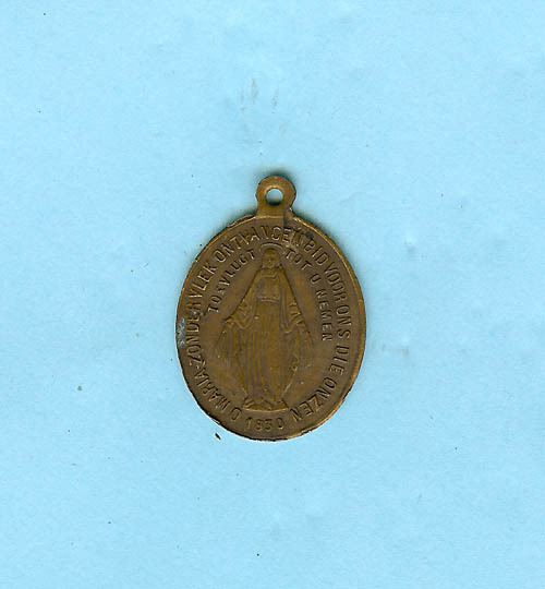 Penningen met Maria als onderwerp op de voorzijde maria in ovaal op de keerzijde, 1) Dit immaculeus beeld is ontvoerd..., 2) Zonder vlek ontvangene bid voor ons..., 3) Maria in ovaal met chinese karakters 4) een ronde penning aartsebroeders der heilige familie