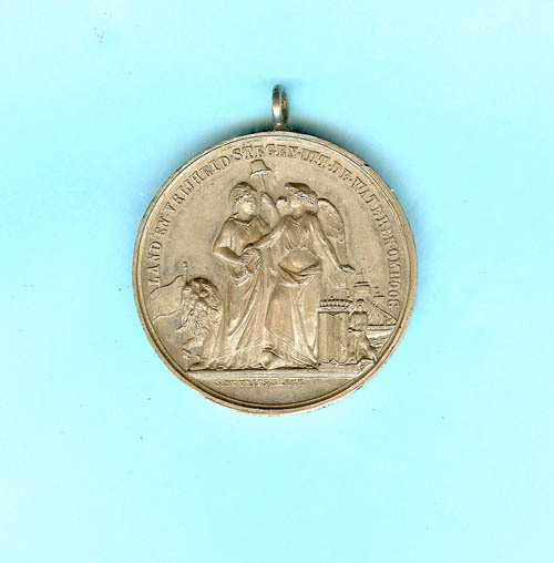 Penning met oog met op de voorzijde twee figuren en de Nederlandse leeuw met vaandel met omschrift Land en vrijheid stegen uit de wateren omhoog. Keerzijde met gekroonde wapenschilden en de tekst Herinnering aan het derde eeuwfeest 1 april 1872 Brielle, centraal het jaartal 1572 en de kreet Je maintiendrai