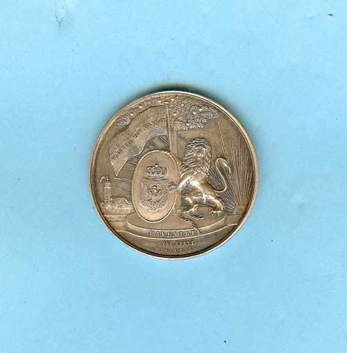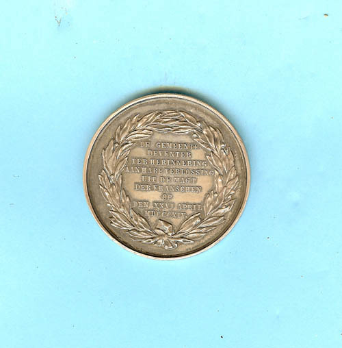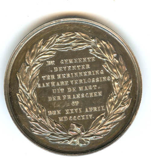 Herinneringspenning ter herdenking van de bevrijding van de Fransen, uitgebracht 26 april 1864, 50 jaar na dato, DE GEMEENTE DEVENTER TER HERINNERING AAN HARE VERLOSSING UIT DE MAGT DER FRANSCHEN OP DEN XXVI APRIL MDCCCXIV, op de keerzijde de Nederlandse leeuw met wapen van deventer en de vaandel met de tekst Vrijheid met Oranje, drie ...