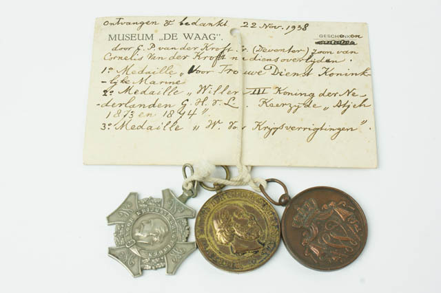 Drie medailles van Cornelis van der Kroft, 1 voor Trouwe dienst Koninklijke marine, 2 Koning Willem III Koning der Nederlanden G. H. V. L. Atjeh 1873 en 1874, 3 Medaille W voor Krijgsverrichtingen