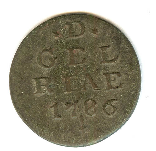 Duit met op de voorzijde D GEL RIAE en jaartal, keerzijde met gekroond wapen van Gelderland IN DEO SPES NOSTRA