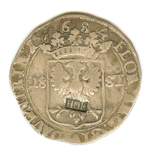 28 Stuiver met gekroond wapenschild van Deventer met omschrift FLOR ARG CIV DAVENTRIAE, keerzijde gekroonde Dubbele adelaar met OPIGN DG ELEG ROM IMP SEM AVG, met klop Holland in wapen van Deventer
