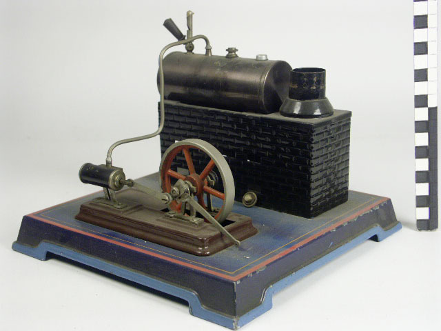 gelakt en verchroomd ijzer; basis blauw-donkerblauw-rood en oranje bies; op basis een aandrijving in bruin; zwarte ketelsteun in steenmotief met schoorsteen; stoomketel van blank metaal op voorkant waterpeiler; op ketel verder: manometer, stoomfluit met zwart houten handvat, stoomafvoerleiding naar koperen cilinder, veilig- heidsschroef en watertoevoerschroef; aandrijfwiel in rood, met vernikkeld loopvlak; cilinder in zwart en ...