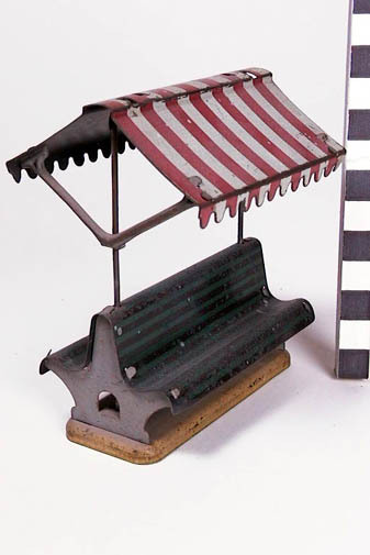 bedrukt blik; scherm rood en grijs gestreept; zittingen en rugleuningen groen en zwart gestreept; zijkanten bank grijs; grondvlak olijfkleurig