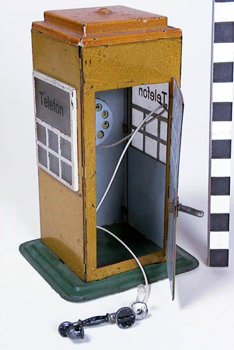 geverfd blik; gele telefooncel op groen grondvlak; aan voorkant opengaande deur; aan zijkanten een matglazen ruit met zwart opschrift: TELEFON , in wit raamwerk; aan achterkant, boven een gat; binnenkant grijs; aan achterwand een telefoon met giet- ijzeren hoorn aan (vernieuwde) elastieken draad; verg. inv.nr.N0617 A/B