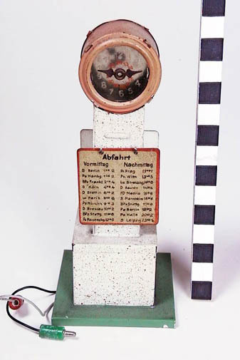 geverfd blik; klok roze, wijzerplaat cellofaan met witte cijfers in buitenste cirkel (1 t/m 12) en roze cijfers in binnenste cirkel (13 t/m 24); zwarte wijzers; stellage wit met roze bespat; grondvlak groen; binnen- en onderkant wit; aan voor- en achterkant stellage een los, crème bord, rood omranden met zwart opschrift: ABFAHRT VORMITTAG NACHMITTAG ...