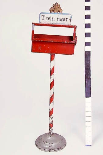 geverfd blik en gietijzer; schelpbekroning in goud; bord met TREIN NAAR in wit met blauwe rand en zwarte letters; kaartenraam en -bak in rood; paal rood en wit; basis grijs; in het raam onder het bord TREIN NAAR kunnen kaartjes geschoven worden; het raam kan daarna gedeeltelijk afgesloten worden door een schuif rechts; erachter een ...