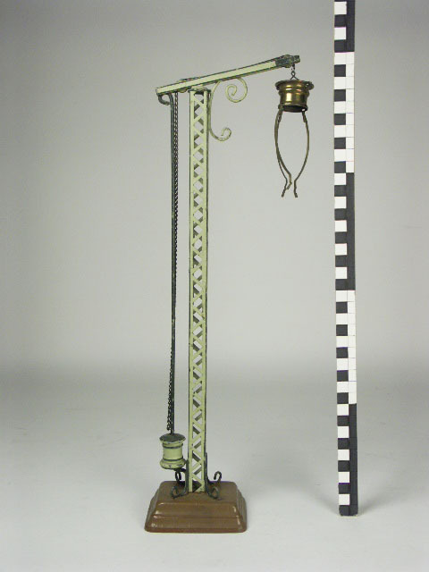 geverfd blik; booglamp voor kaarsverlichting; verstelbaar met ketting en tegenwicht; melkglazen bol in messing vatting; stellage en tegenwicht: lichtgroen met donkergroen; basis: bruin met donkerbruin biezen; gemerkt aan onderkant