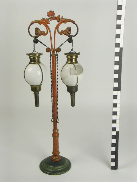geverfd gietijzer; booglamp met 2 lampen voor kaarsverlichting; men kan de bollen afzonderlijk laten zakken via kettingen die langs katrollen lopen; de bollen worden in hoogste stand beves- tigd door ogen aan de kettingen te haken aan haken aan paal; melkglazen bollen in messing vatting waarvan het onderstuk afneembaar is; rode paal en bogen met ...