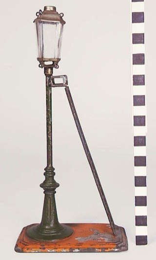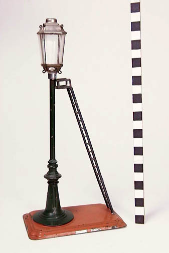 geverfd blik en gietijzer; vertind blik; 2 exemplaren met ladder; straatlantaarns voor olieverlichting; de paal dient als oliereservoir; de eigenlijke lantaarns, van glas in vetind blikken vatting, zijn afschroefbaar; palen en ladders zijn groen; grondplaten oranje; gemerkt aan onderkant; bovendien erin