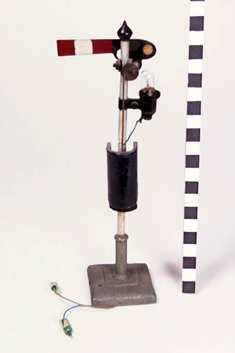 geverfd blik; enkele seinpaal die dmv elektromagneet in 3 standen gezet kan worden; verlicht door elektrisch lampje in een zwarte armatuur die het licht richt op een wit, groen of leeg (zie rest.) venstertje in het sein; sein: rood en wit aan voorkant, zwart met een wit, groen en een leeg venstertje aan achterkant; paal: ...