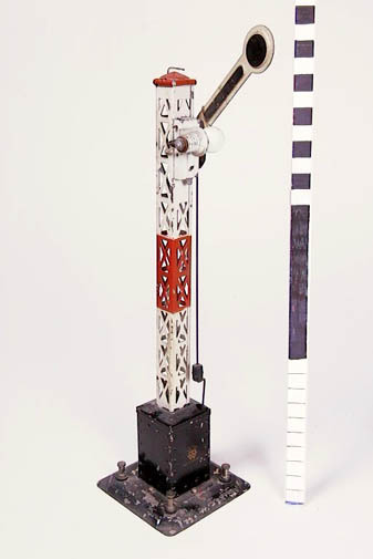 geverfd blik; enkele seinpaal die werkt dmv enkelvoudige elektromagneet en elektrisch wordt verlicht; 18 volt; sein: wit en rood; achter de vensters van het sein een fitting met peertje; voet en grondplaat: zwart; op de grondplaat 4 contactpunten van vernikkeld ijzer; gemerkt in goud op 1 zijde van de voet; op de zijde en tegenover ...