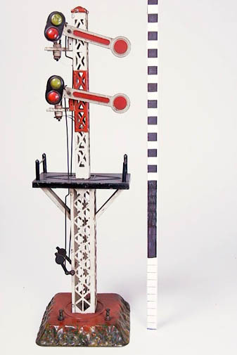 geverfd blik; dubbele seinpaal met handbediening; elektrisch verlicht; seinen: wit en rood aan voorkant; zwart en wit aan achter- kant; een groen en een rood mica ruitje in de zwarte korte delen; paal: rood en wit; zwarte omloop; achter de ruitjes van de seinen een metalen plaatje met fitting; zwarte hendels; basis: 1 draad vanaf ...
