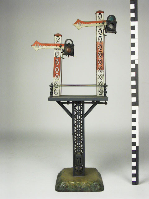 geverfd blik; dubbele seinpaal met handbediening en petroleumverlichting; seinen: rood en wit; een groen en een rood mica ruitje in de zwarte korte delen; stellage: bovenste palen rood en wit; achter de ruitjes van de seinen zwarte lantaarns met ronde, blanke mica ruitjes, voor en achter, in vierkante ramen; grijze omloop met zwart hekwerk; onderste ...
