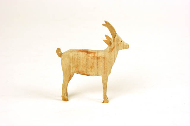 Vier uit hout gesneden dieren: 2 koeien, 1 varken, 1 geit. De hoorns, oren en staarten van de koeien en de geit en de staart van het varken eraan gelijmd. Fabrikaat: Ertsgebergte. A.Koe. B.Koe. C.Varken (5x1,3x8,7). D.Geit (7,x1,1x7).