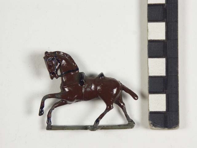 bruingeverfd paard in tinlegering; zwart tuig; zwarte voor- en achterrand van het zadel; midden in het zadel een gat voor de ruiter; op grijs voetstukje.