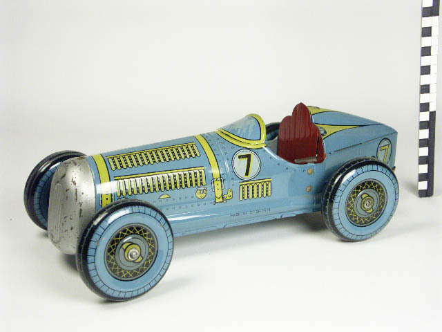 bedrukt blik; blauwe auto met opdruk in geel en zwart, met in 4 cirkels opdruk 7; voorfront in zilverbrons met ingepers stempel METTOY-merk; spiraalveer, met losse sleutel, op achteras; voorwielen verstelbaar in alle richtingen door stuur- mechanisme op zijkant; MADE IN GT.BRITAIN