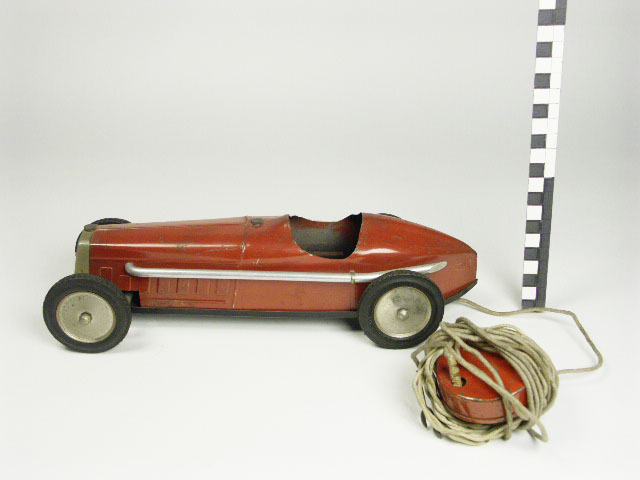 bedrukt blik; rode auto met blank voorfront; wordt elektrisch aangedreven op de achteras; de voorwielen zijn in alle richtingen wendbaar d.m.v. elektrische afstandsbediening; de 4 wielen zijn van blank metaal en voorzien van rubber banden met opschrift PNEU MICHELIN