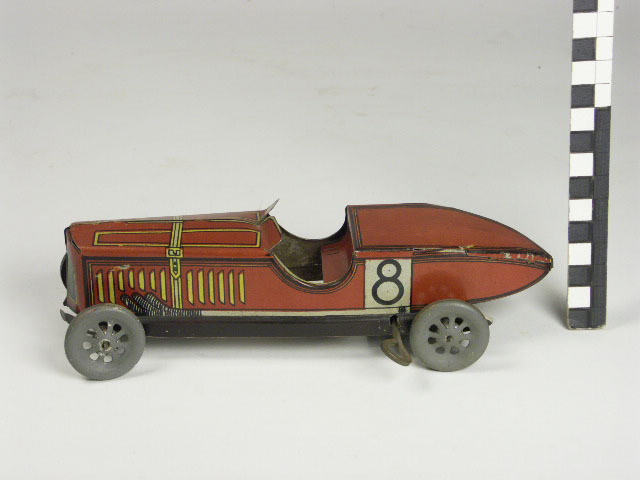 bedrukt blik; rood-geel en grijs met zwarte bies gemar- keerde auto; schroefveer opwindbaar met vaste sleutel op achteras; rechtervoorwiel wendbaar in 3 standen: vooruit-rechtsom- linksom; op rechterzijkant '8' in zwart op grijze onder- gond; grijze wielen; model identiek aan inv.nr.N1051