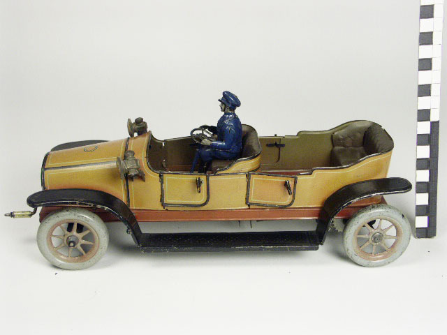 bedrukt blik; auto met open cabine en carrosserie in de kleuren rood-zwart-donkerrood; motorkap en carrosserie in rood-zwart en gele bies; doorlopende spatborden en treeplanken zwart; bestuurder met pet in blauw en zwart; 2 koplampen in rood en zwart, rechts en links van de cabine; 2 voor- en 2 achterdeurtjes kunnen worden geopend; de vooras verstelbaar ...